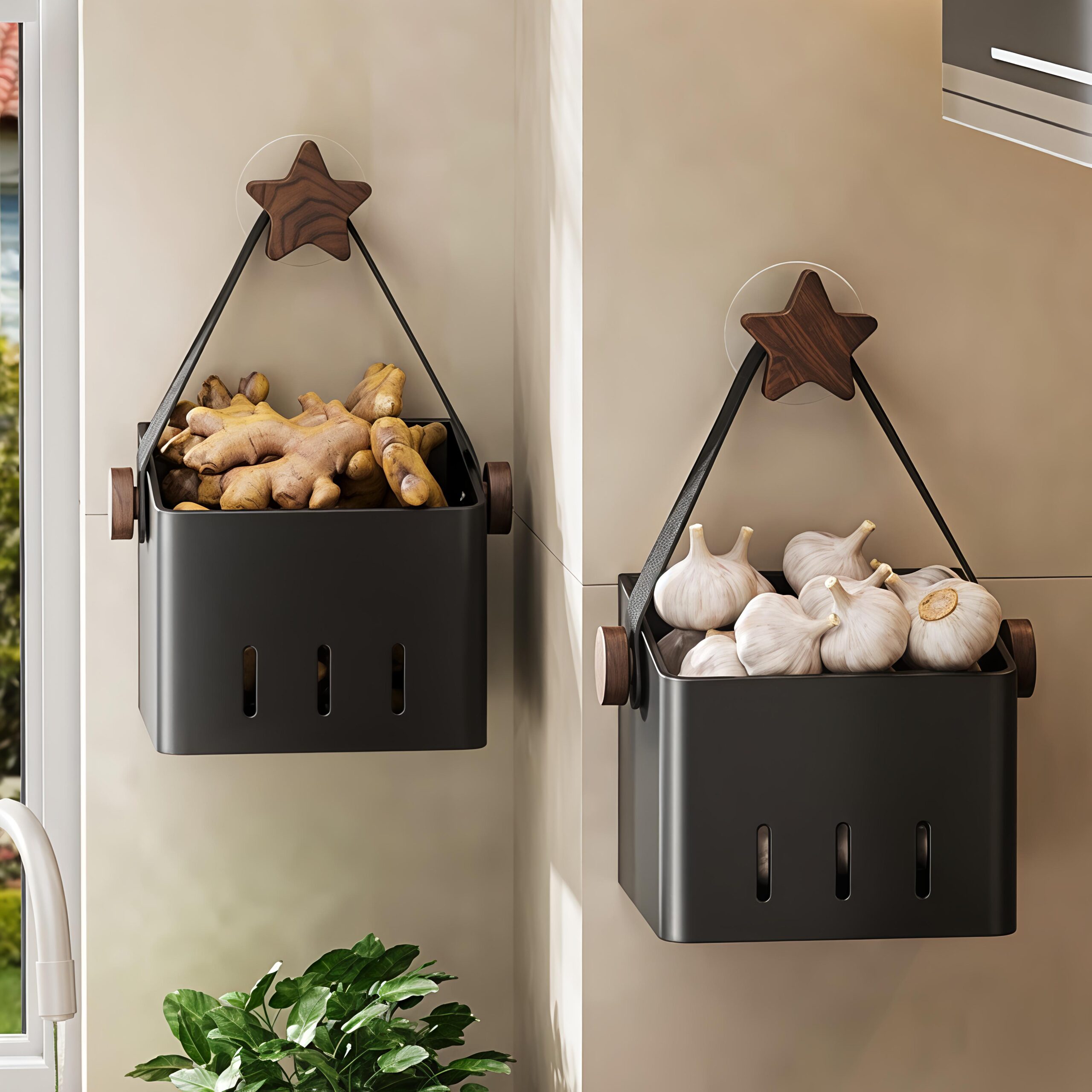 Features real walnut wood handles and star hooks for a warm rustic look. Open side slots ensure airflow to keep produce fresh and visible. Quick Drill-Free Installation