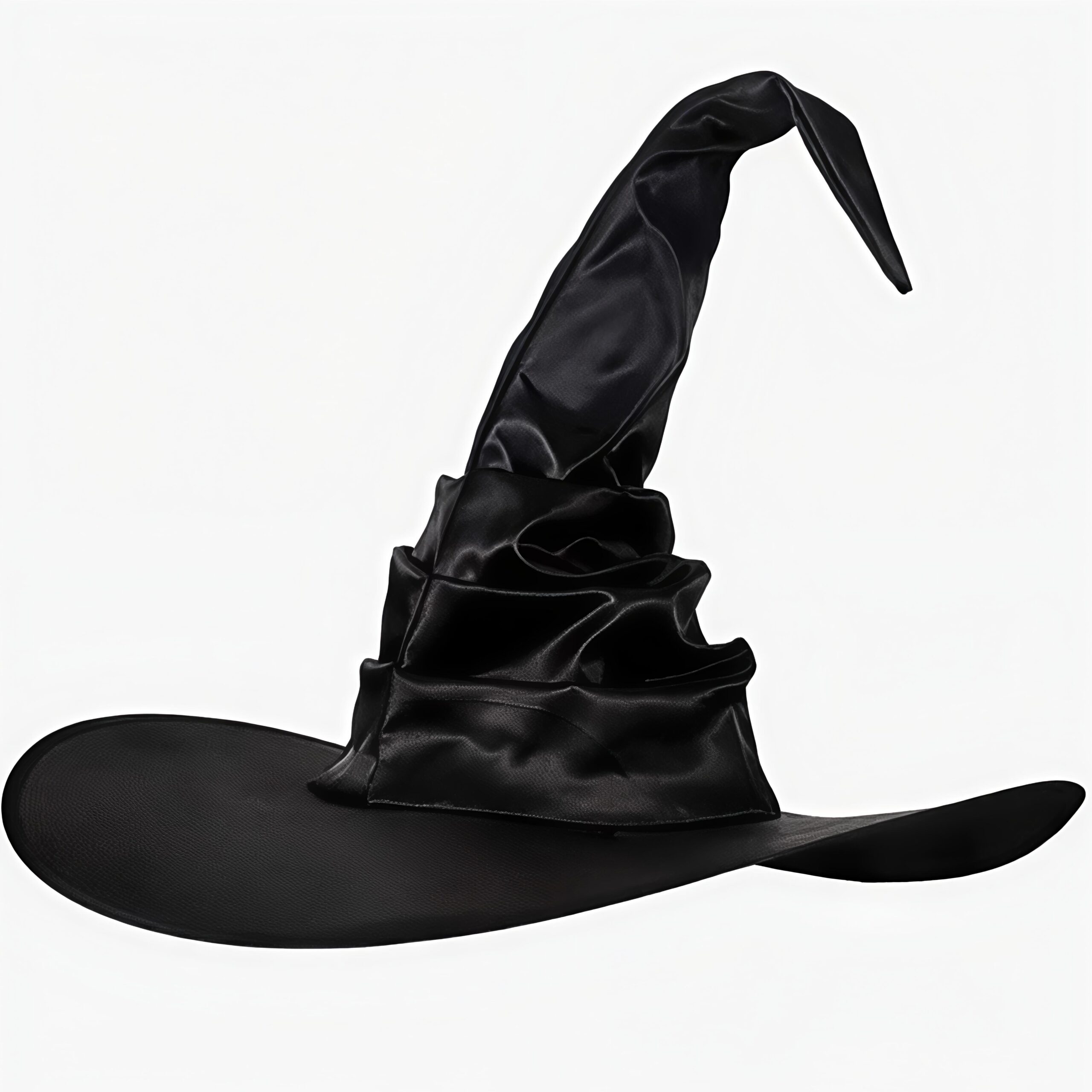 Features the traditional witch hat silhouette with a wide brim, tall pointed top, and textured crinkles. Embellished with spider/bat pendants or tassels for added eerie detail.